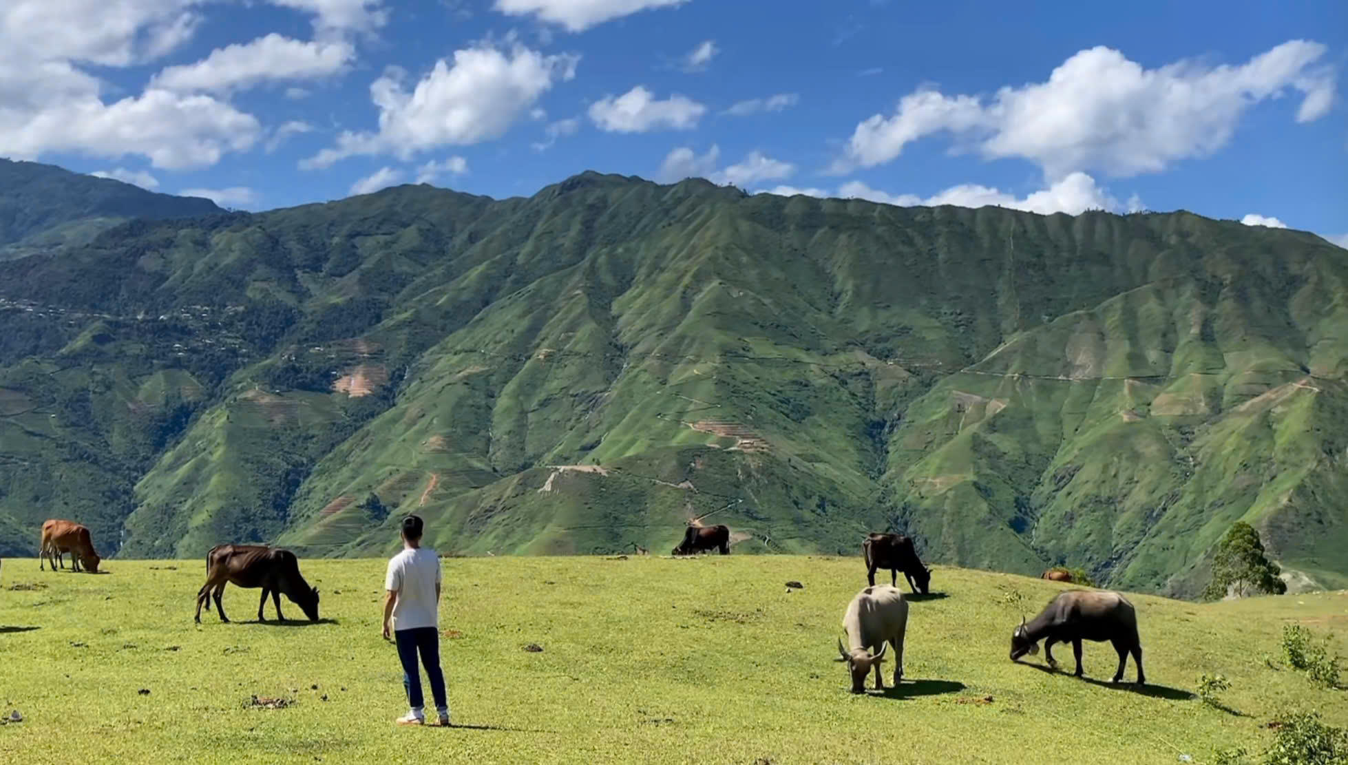 Cách trung tâm xã Tà Xùa khoảng 14km, thảo nguyên nằm biệt lập trên một ngọn núi, với những thảm cỏ mênh mông, xanh mướt, rất nên thơ. Trên những triền cỏ ấy, có những em nhỏ người Mông tay cầm bó hoa dại, ngồi trên chiếc xích đu gỗ khúc khích nô đùa, phía bên này là những đàn trâu, đàn bò thong dong gặm cỏ dưới ánh nắng vàng... tất cả đều tạo nên một khung cảnh rất yên bình, giúp chúng tôi như được quay trở về với tuổi thơ, xua tan đi mọi mệt mỏi suốt quãng đường dài.