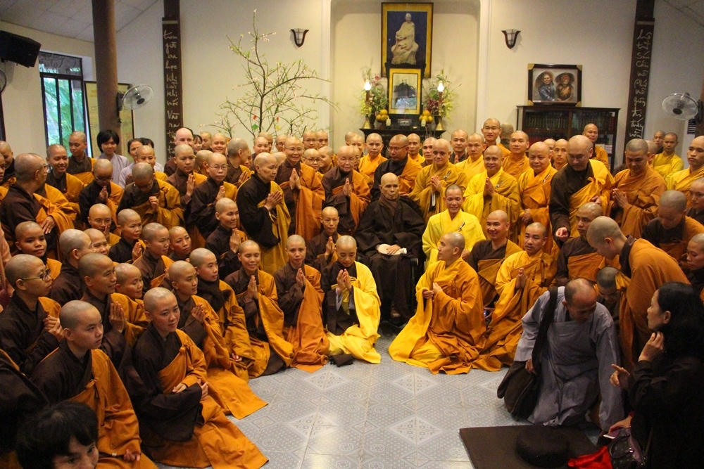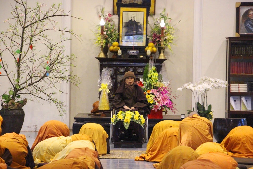 (PLVN) - Sau khoảng 15 phút thực hiện nghi thức trong ngày đầu năm, các tăng ni đứng, ngồi xung quanh thiền sư Thích Nhất Hạnh hát thiền ca.