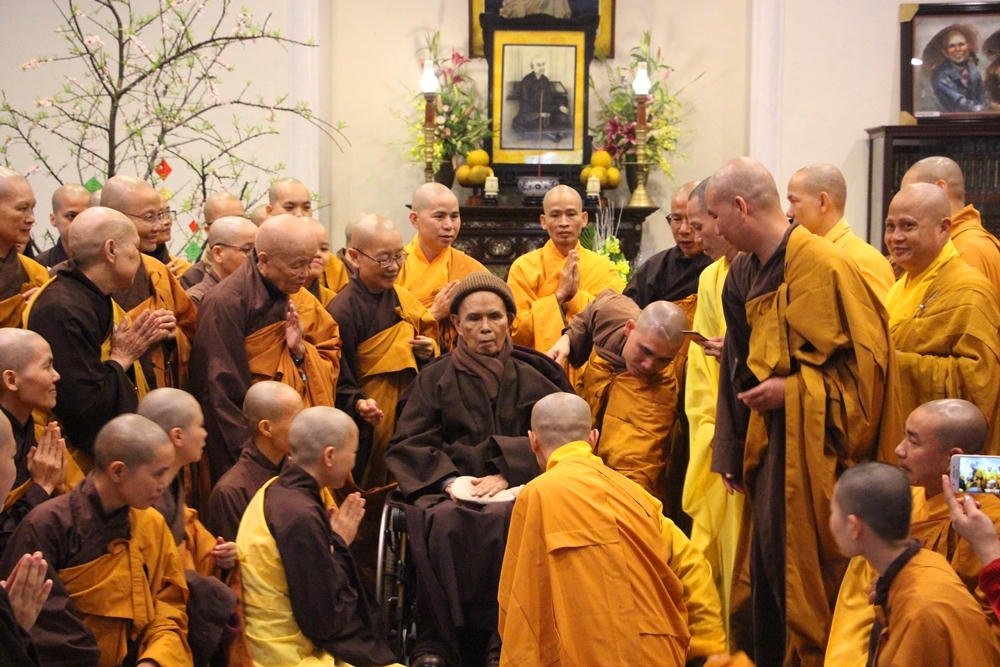 Thiền sư Thích Nhất Hạnh gặp phật tử đi lễ chùa đầu năm