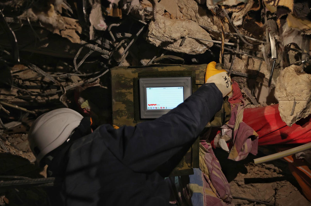 Một nhân viên kỹ thuật đang sử dụng Radar của STM để hỗ trợ các đội tìm kiếm và cứu hộ ở Hatay, miền Nam Thổ Nhĩ Kỳ ngày 10/2/2023. Ảnh: AA