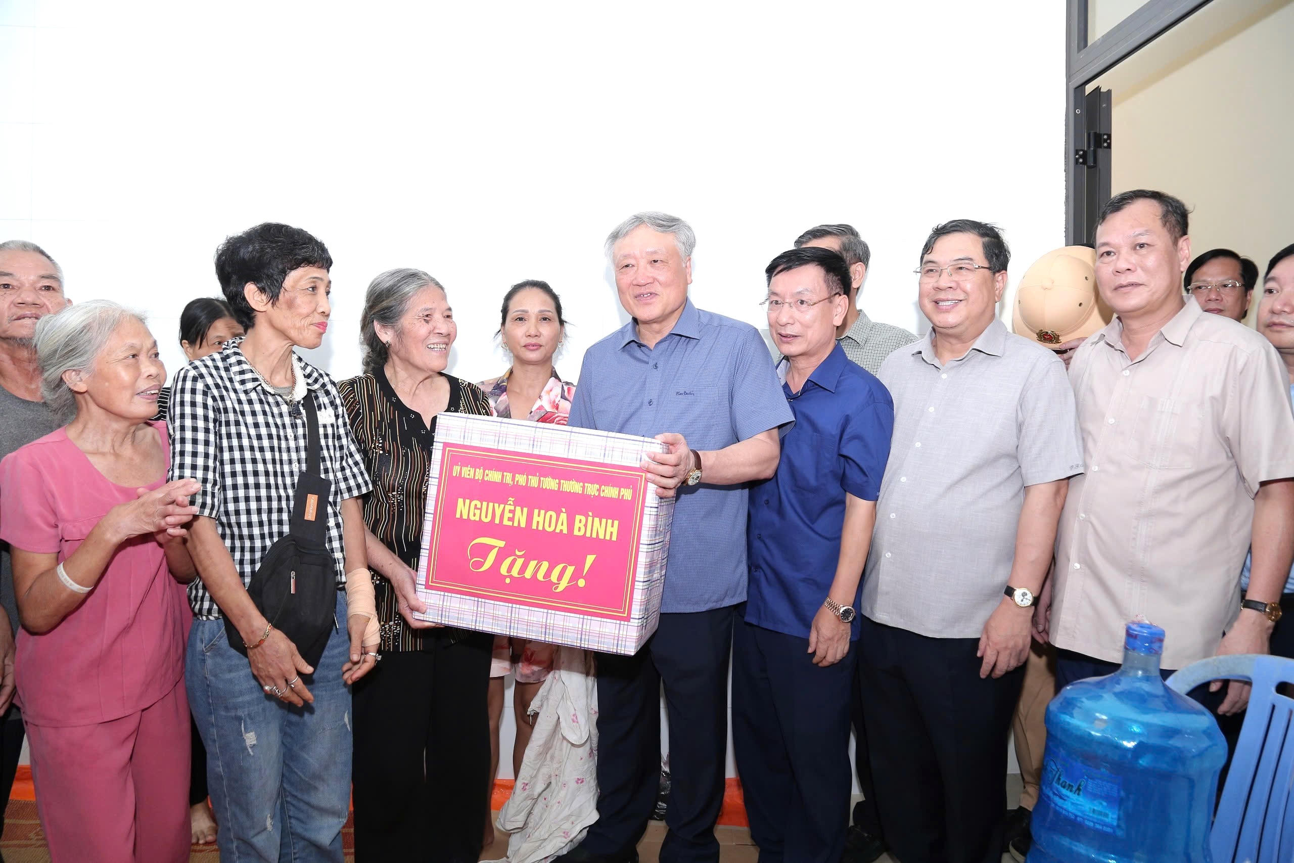 Phó Thủ tướng Thường trực Chính phủ Nguyễn Hoà Bình tặng quà một số người dân tại khu tránh trú bão. Ảnh: Thiên Kim |