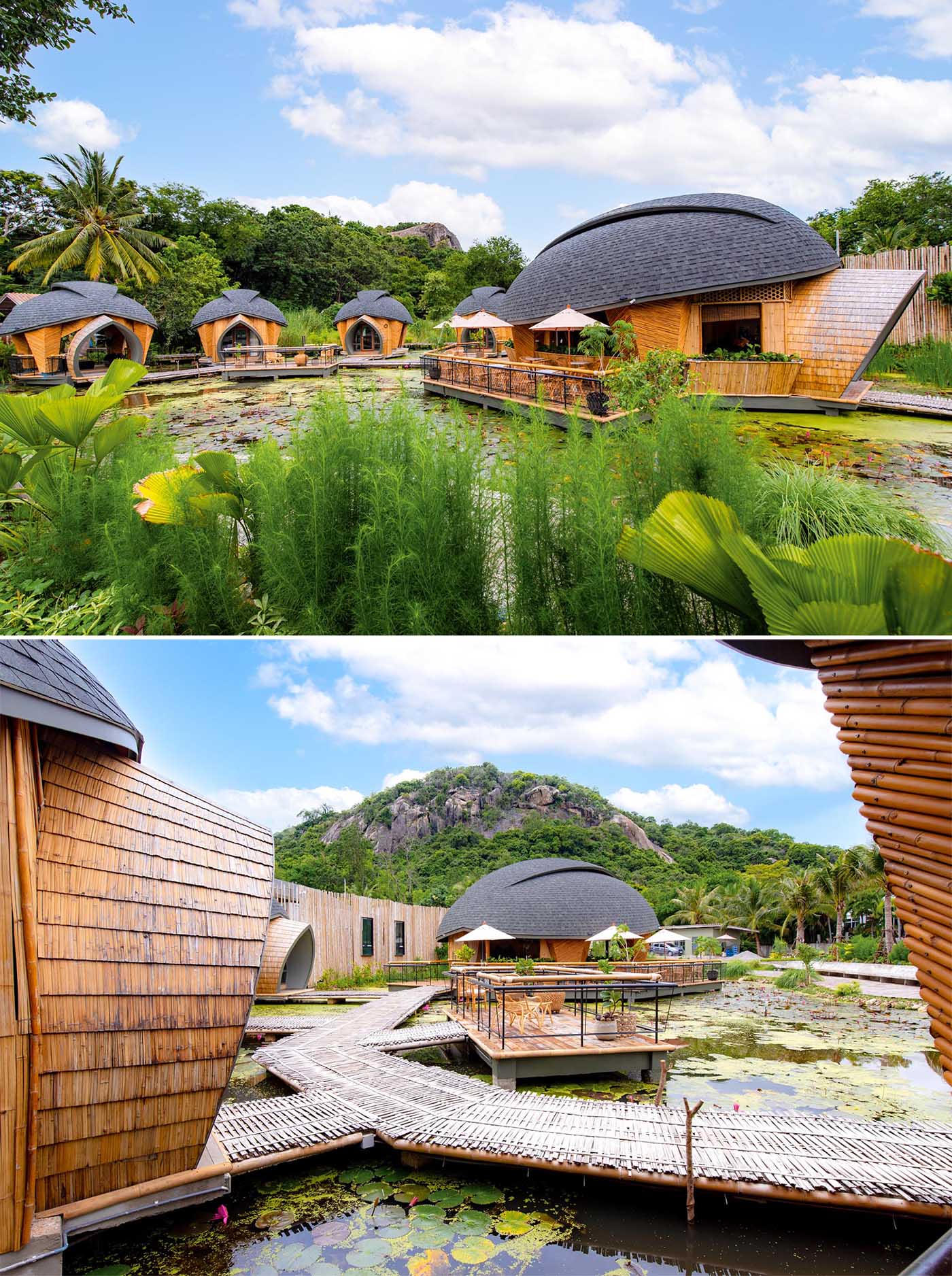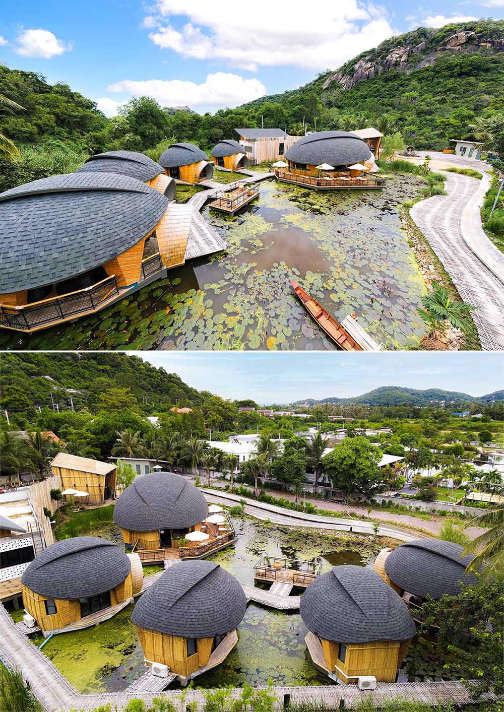 Thiết kế được xây dựng giống như một chiếc ao sen với những nhà nghỉ có mái nhà hình dạng mai rùa.