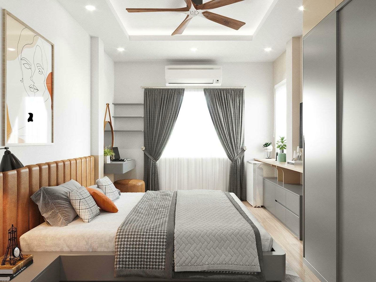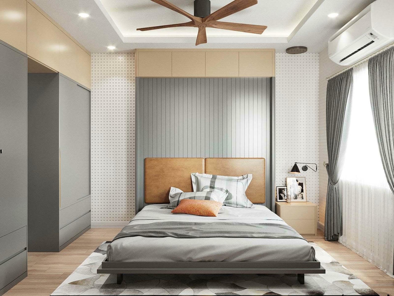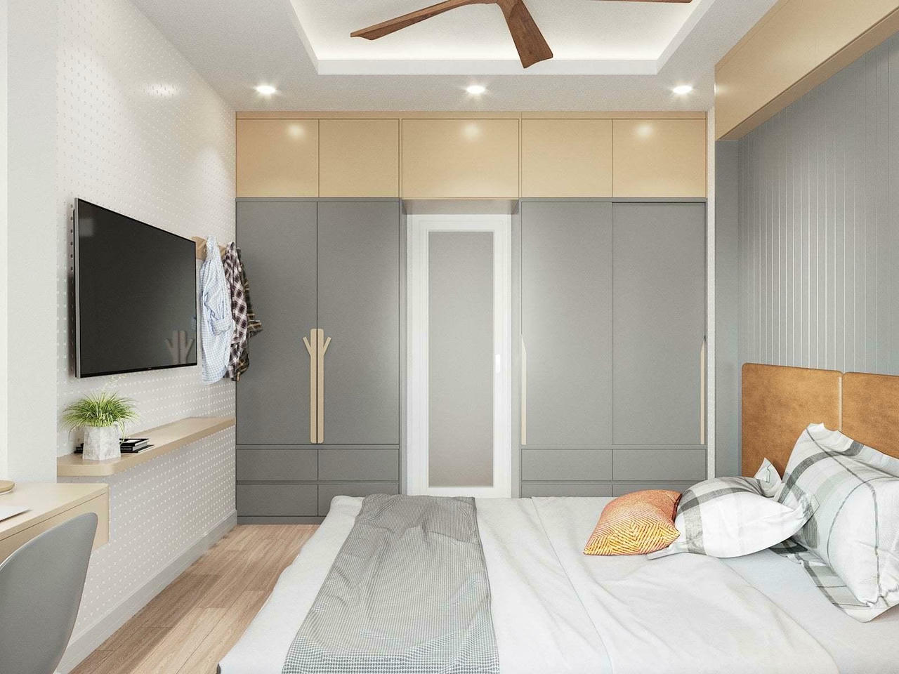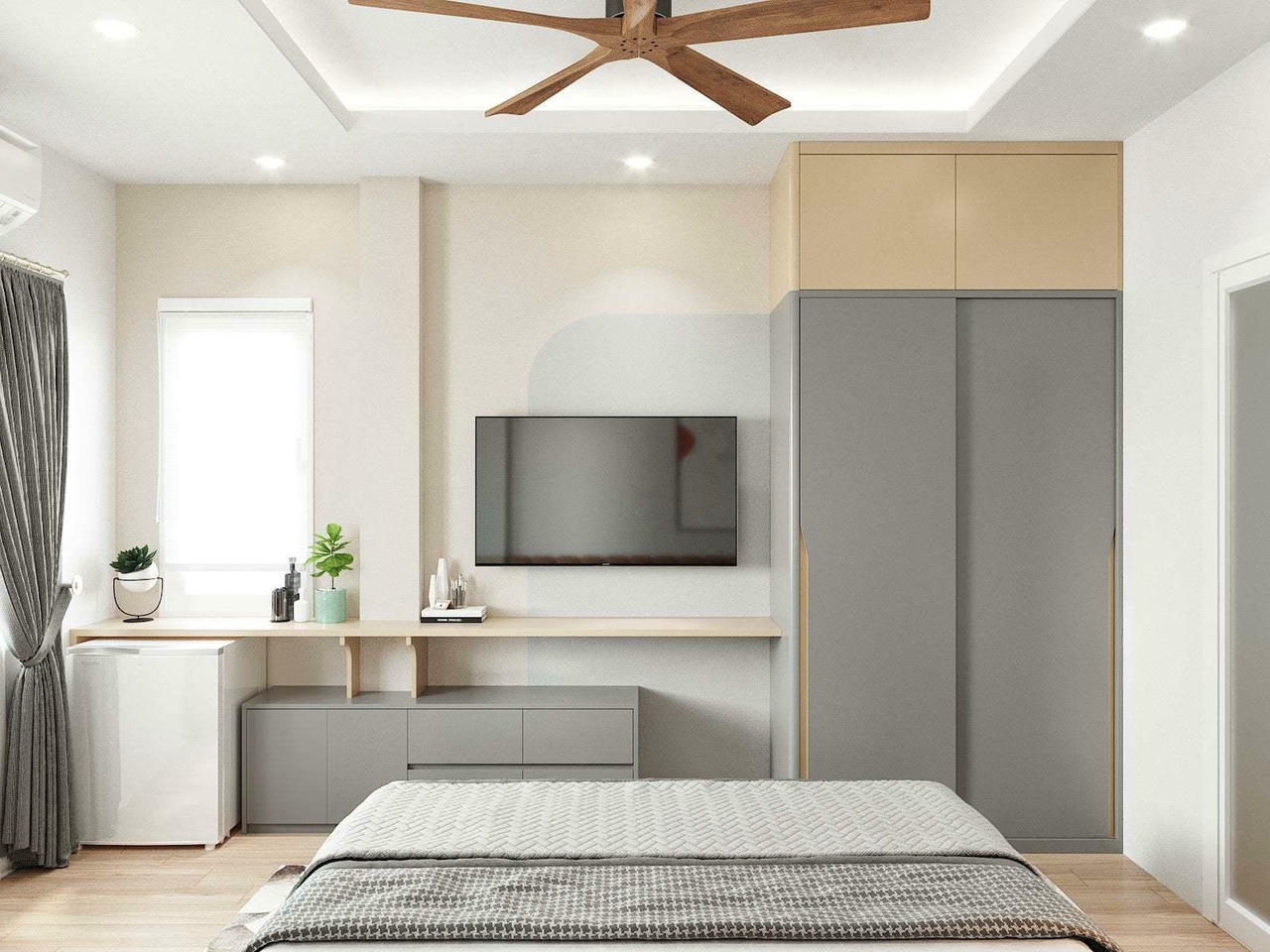 Phòng ngủ số 1 vẫn bố trí được 1 giường, 1 tủ quần áo, kệ ti vi kiêm đựng đồ lặt vặt và tủ lạnh mini.