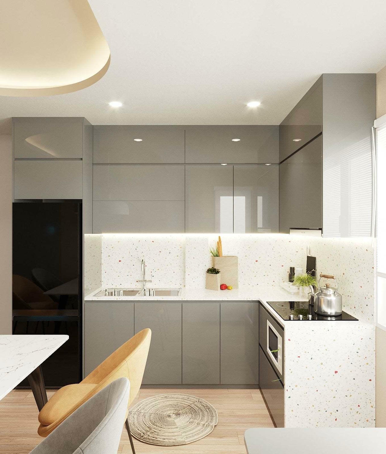 Tủ bếp bằng chất liệu chống ẩm phủ melamine, có tính bền vững theo thời gian. Mặt bàn ăn bằng đá nhân tạo, phù hợp với đá tủ bếp. "Với diện tích bé nhưng gia chủ thích có không gian nấu nướng thoải mái, tụ tập bạn bè nên phương án này rất khả thi", kiến trúc sư Trịnh Đình Quyền nói.