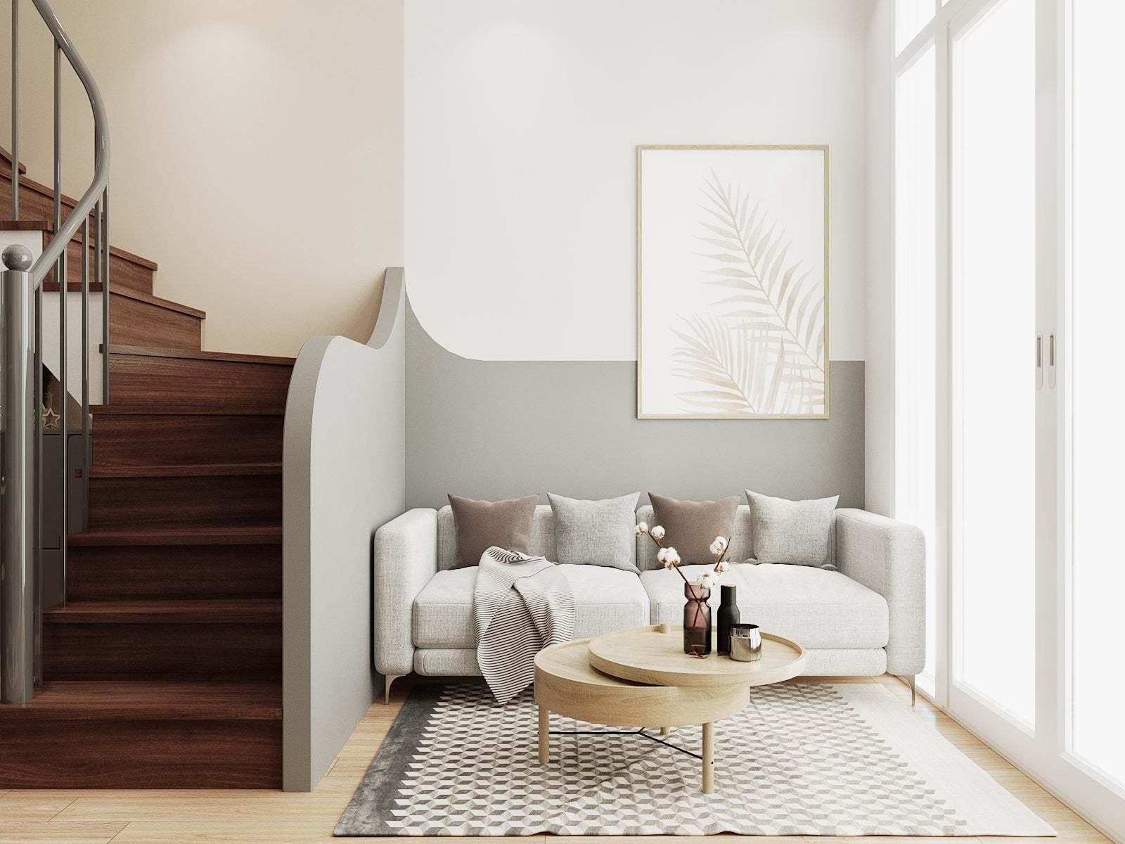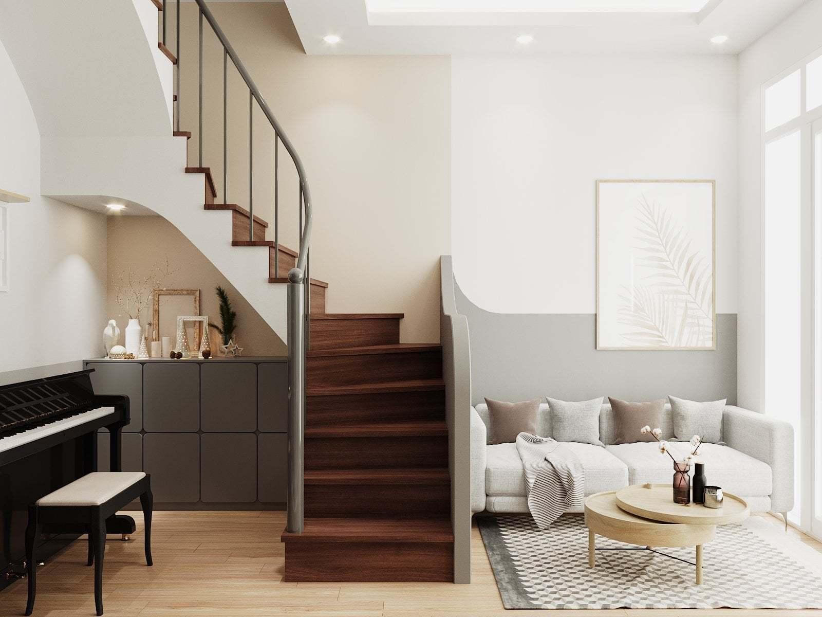 Tầng 1 không đặt vệ sinh và bếp như các công trình khác nên khá rộng rãi. Phần ngoài đặt bộ bàn ghế tiếp khách. Phía trong gầm cầu thang là nơi để đàn piano và tủ kệ trang trí. Với diện tích bé, gam màu sáng sẽ giúp "ăn gian" diện tích.