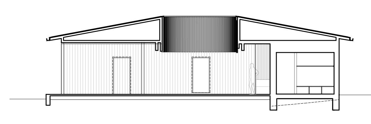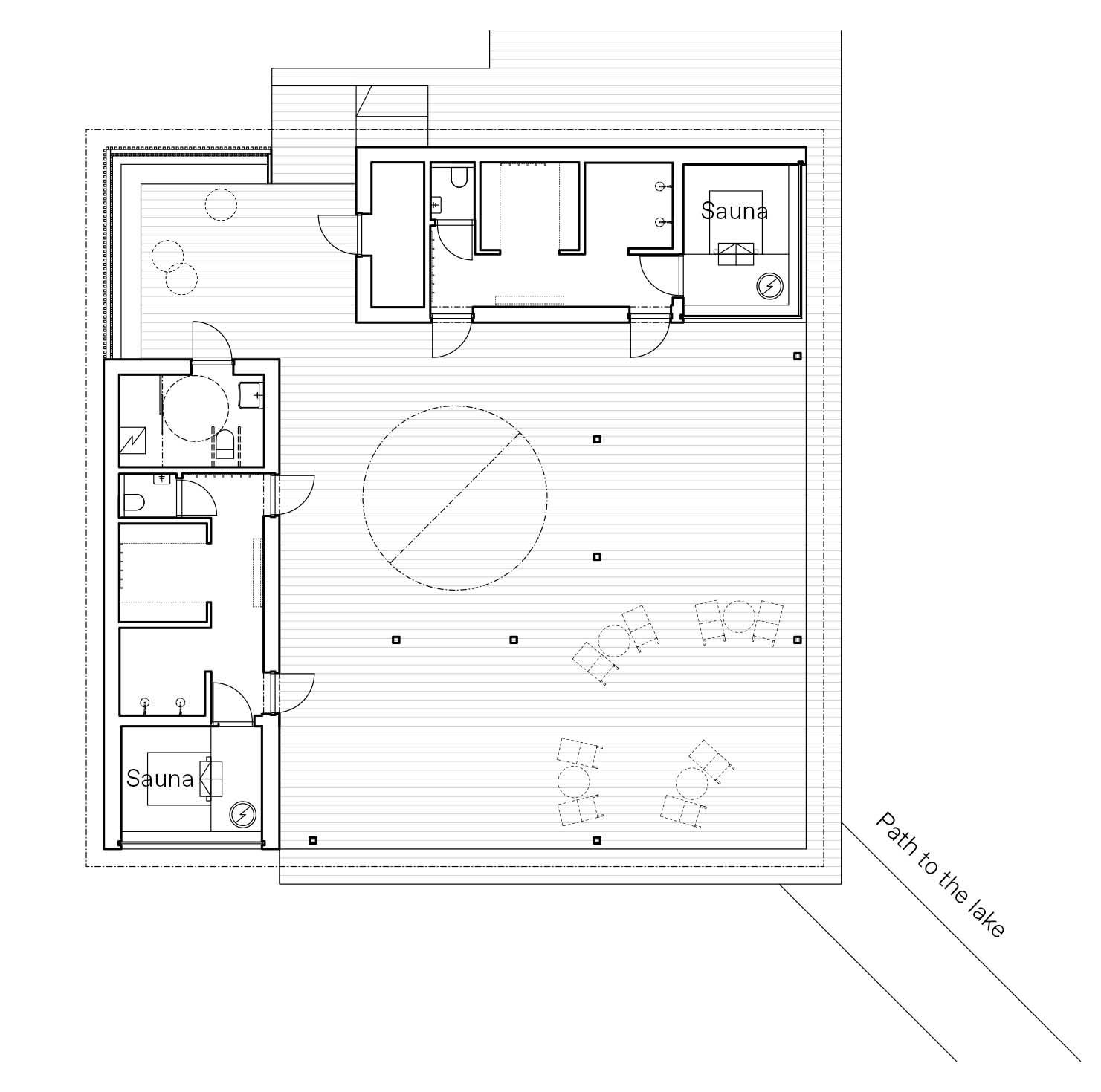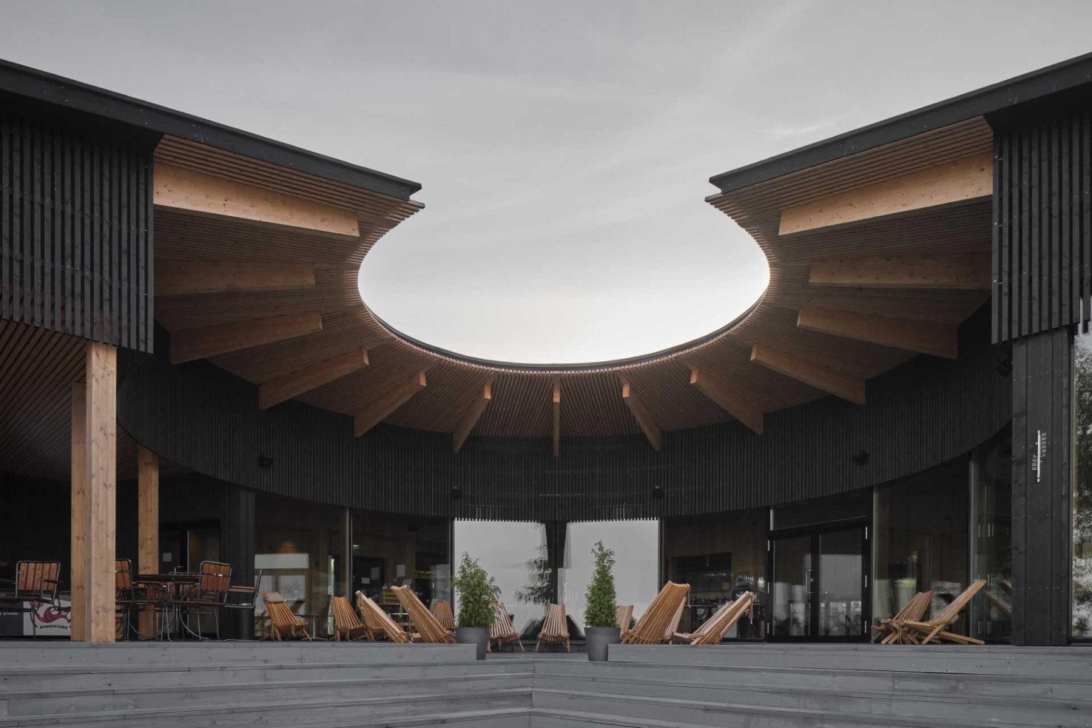 Ngoại thất phòng xông hơi khô có mái che có một lỗ tròn độc đáo trên mái nhà, tạo ra một liên kết giữa các tòa nhà.
