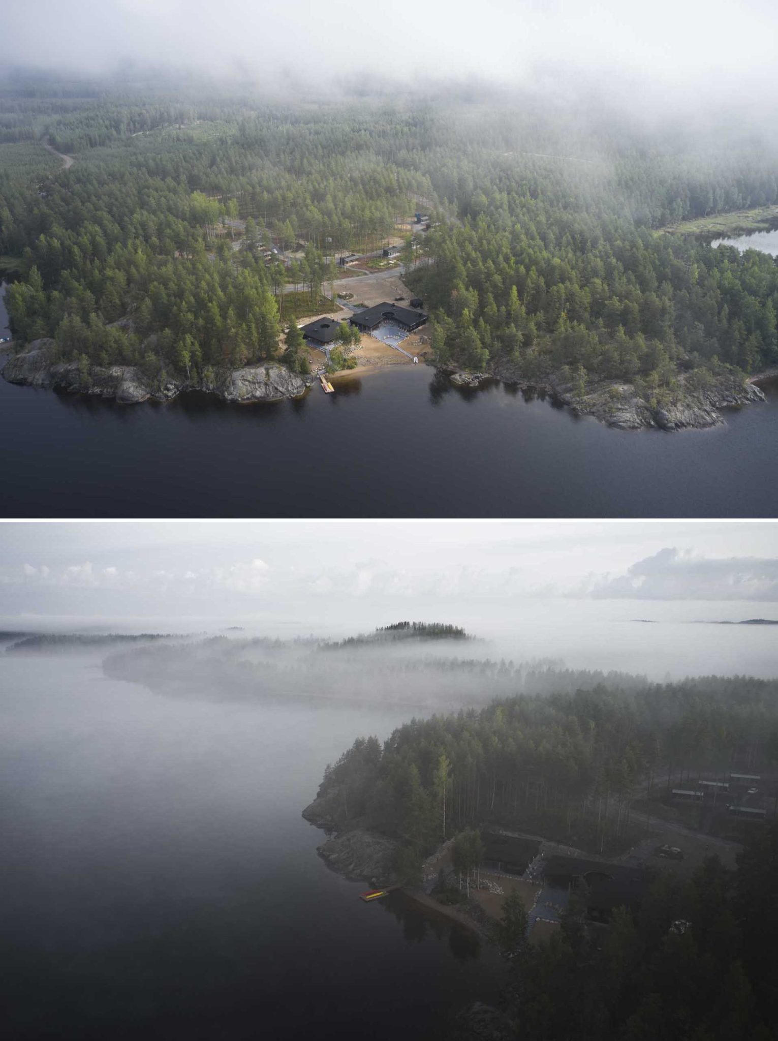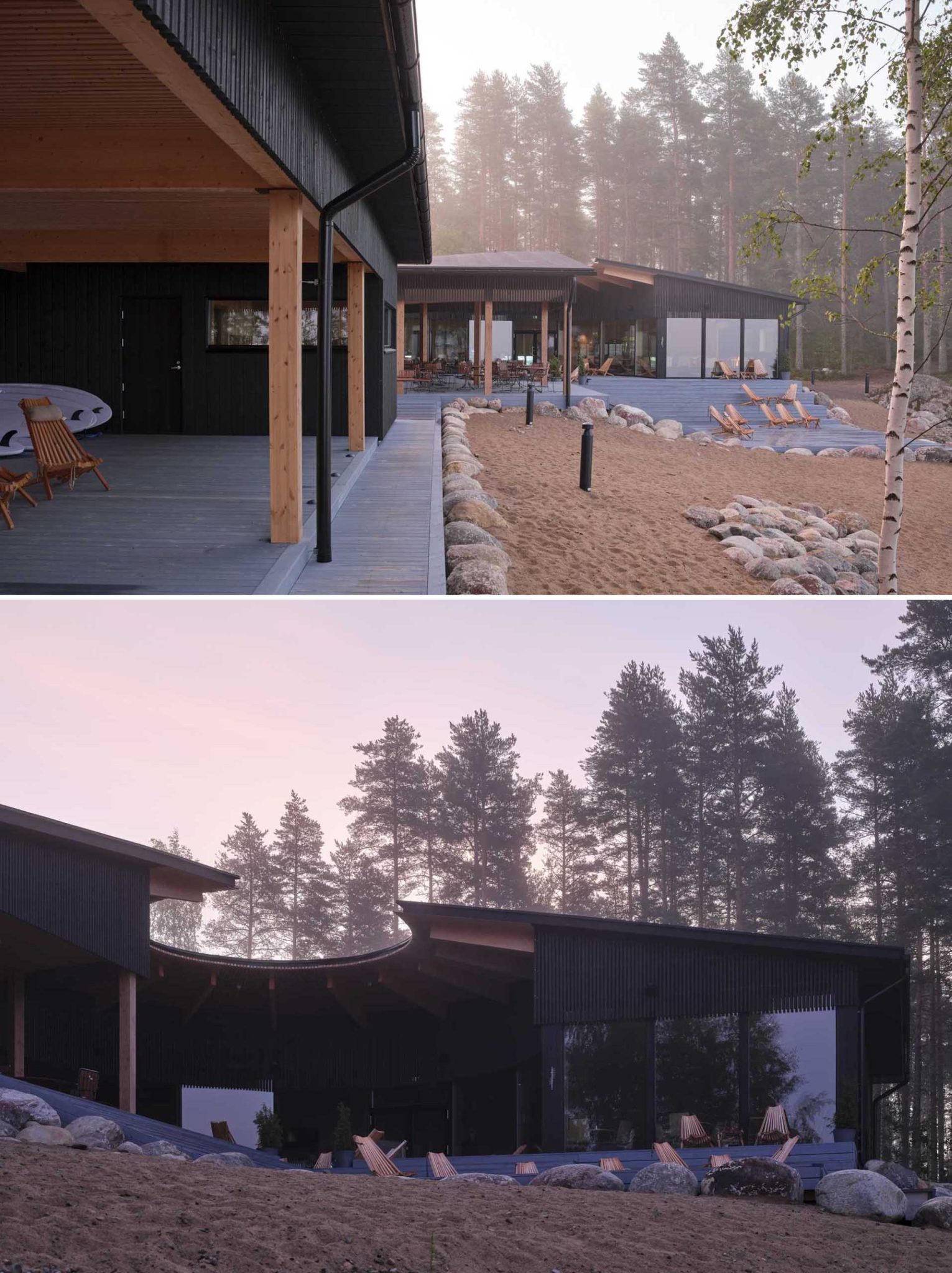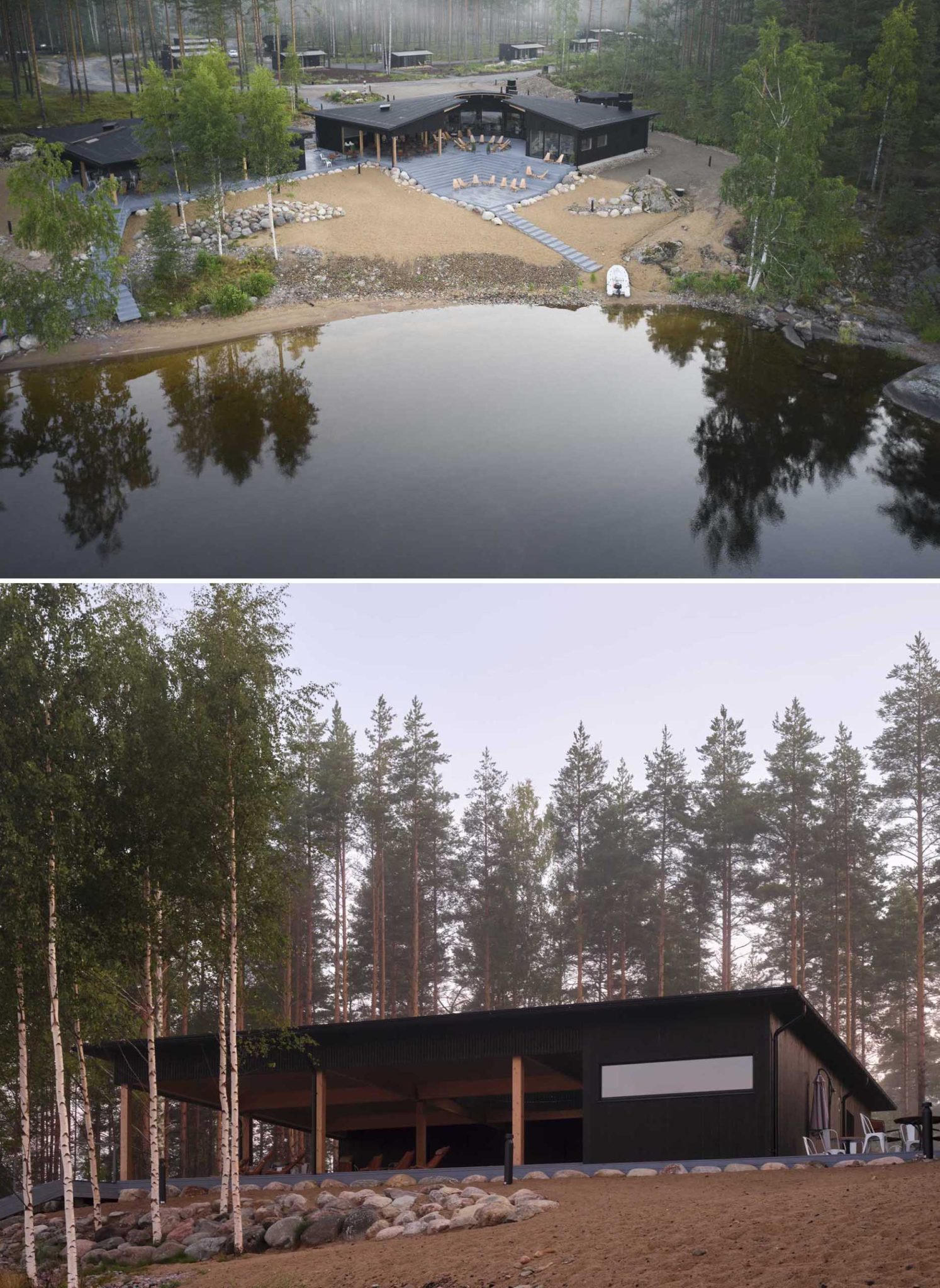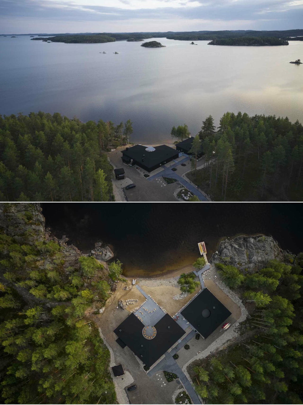 (PLVN) - Thiết kế này thuộc khu nghỉ dưỡng Pistohiekka tại Phần Lan. Thiết kế bao gồm nhà hàng và phòng xông hơi khô ven hồ, với các tòa nhà được thiết kế bằng gỗ đen bên ngoài với nội thất bên trong là gỗ tự nhiên tạo nên sự tương phản, độc đáo.