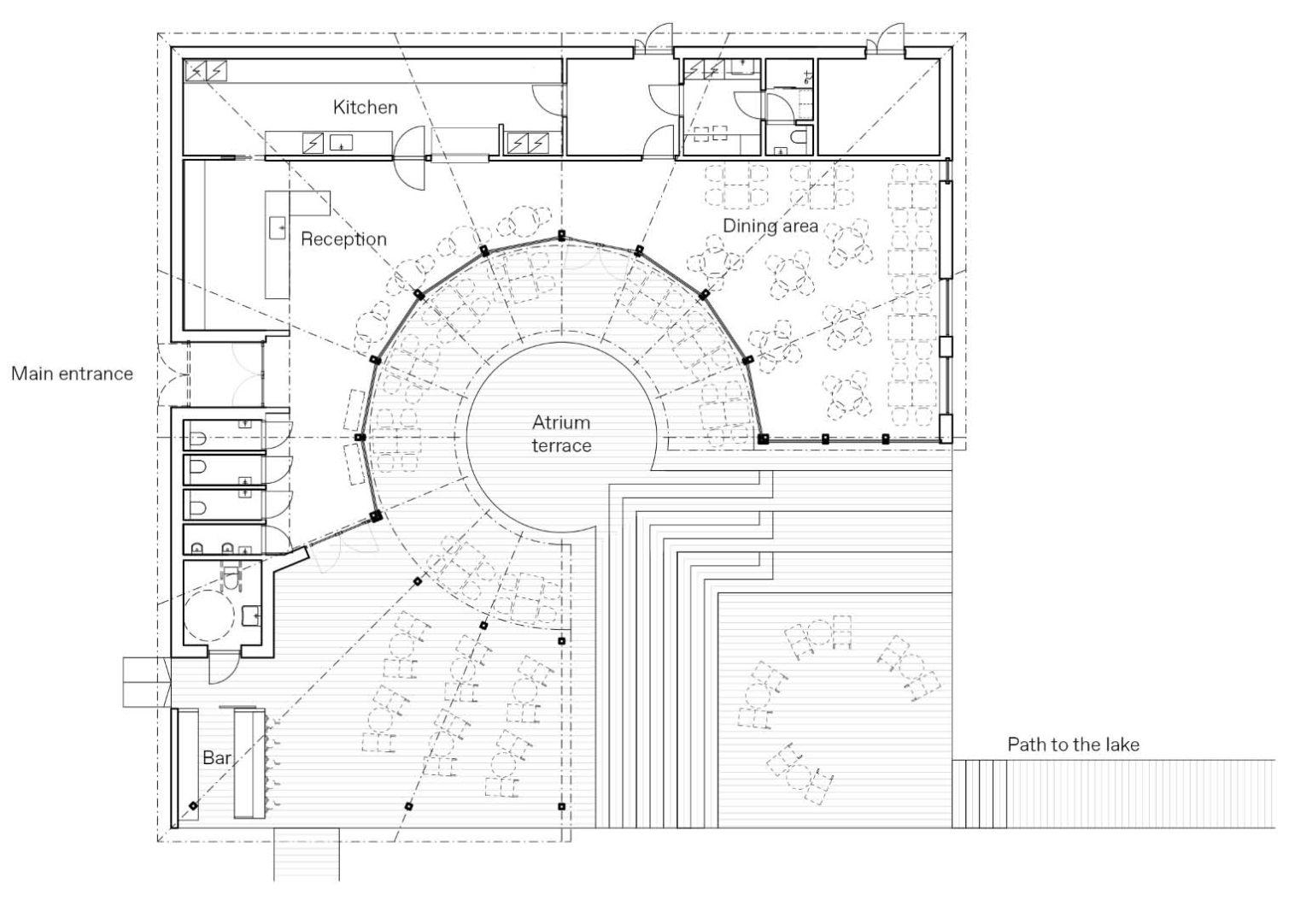 Nhà hàng và phòng xông hơi khô ven hồ có thẩm mỹ thiết kế mạnh mẽ dựa trên không gian nhà hàng và phòng xông hơi khô xoắn ốc xung quanh.