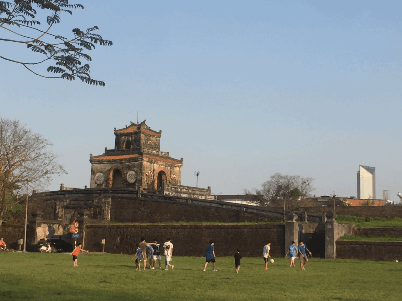 Thiếu sân chơi, các bé trai tìm bãi cỏ để chơi đá bóng. |