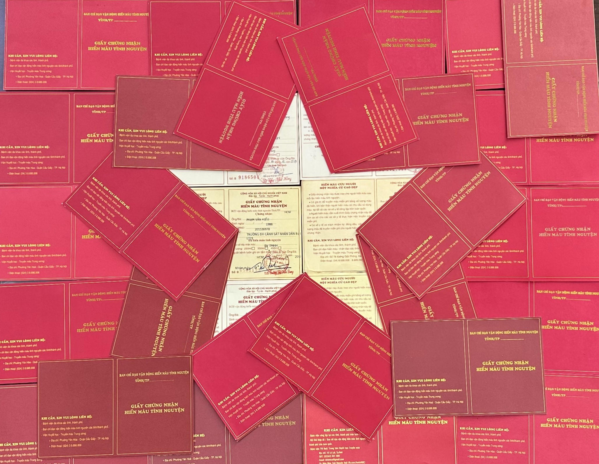 Với mong muốn thực hiện và lan tỏa hình ảnh đẹp, Thiếu tá Phạm Văn Hiếu, cán bộ Đội Cảnh sát Quản lý hành chính về trật tự xã hội Công an huyện Hòa Vang (Đà Nẵng) đã quyết định ghép hình lá cờ Tổ quốc từ Giấy chứng nhận hiến máu của mình.
