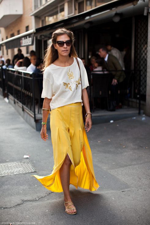 Đầm dài vàng mù tạt kết hợp cùng chiếc mũ newsboy, khiến bạn trở thành cô gái Pháp thời thượng lại lãng mạn. Nếu bạn hướng tới phong cách du mục, hãy mix match đầm với boot và thắt lưng bản to để tăng thêm phần bụi bặm.