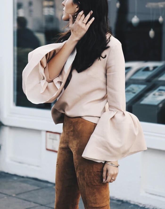 Kết hợp áo tay chuông và chiếc quần nhung giúp bạn mang nét cổ điển và gợi cảm vừa đủ để làm say đắm bất cứ đấng mày râu nào.