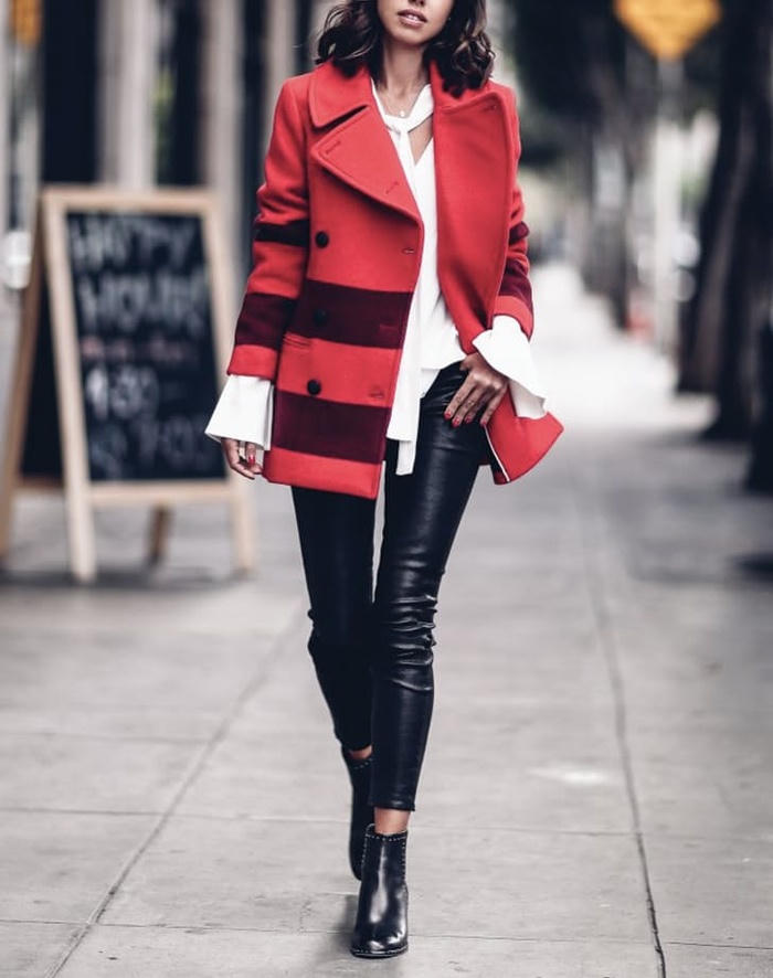 Trong những ngày lạnh giá, chị em có thể mặc áo sơ mi tay chuông với ống loe vừa phải cùng quần legging da và áo khoác giữ ấm cho cơ thể.