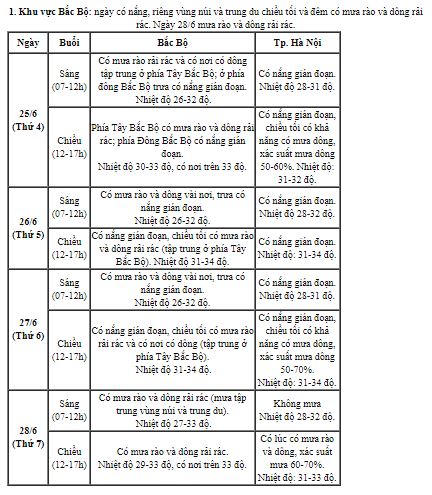 Theo dự báo, ngày 25/6-28/6, Bắc Bộ ngày nắng, chiều tối và đêm mưa rào và dông vài nơi, vùng núi và trung du mưa rào và dông rải rác, cục bộ mưa to.