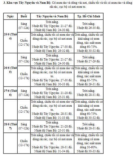Thời tiết Tây Nguyên và Nam Bộ vẫn mang nét đặc trưng của mùa mưa khi mưa rào và dông vài nơi, chiều tối và tối mưa rào và dông rải rác, cục bộ mưa to.