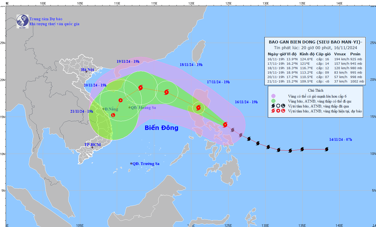 Về cơn bão MAN-YI, theo Trung tâm dự báo KTTV Quốc gia, 19h ngày 16/11, vị trí tâm siêu bão MAN-YI ở vào khoảng 13,9 độ Vĩ Bắc; 124,6 độ Kinh Đông, trên vùng biển phía Đông khu vực miền Trung Philipines. Sức gió mạnh nhất vùng gần tâm siêu bão mạnh cấp 16 (184-201km/h), giật trên cấp 17. Di chuyển theo hướng Tây Bắc, tốc độ 20km/h.