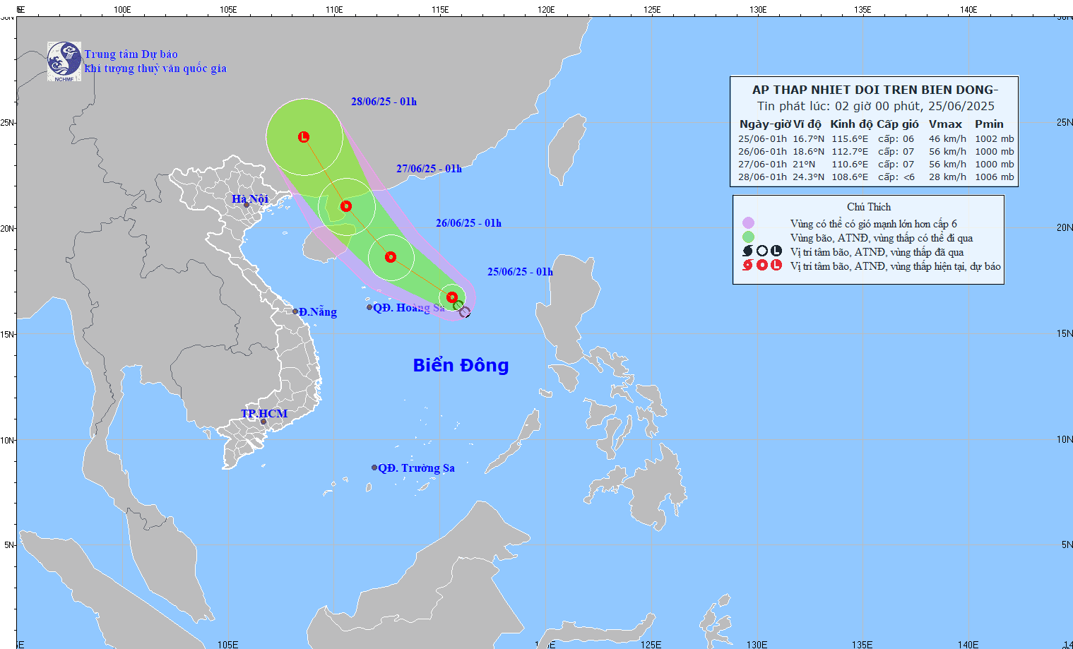 Về áp thấp nhiệt đới trên biển Đông, hồi 1h ngày 25/6, tâm áp thấp nhiệt đới nằm ở khoảng 16,7 độ Vĩ Bắc; 115,6 độ Kinh Đông, cách quần đảo Hoàng Sa khoảng 440km về phía Đông. Sức gió mạnh nhất vùng gần tâm áp thấp nhiệt đới đạt cấp 6 (39–49km/h), giật cấp 8. Hệ thống này đang di chuyển theo hướng Tây Bắc với tốc độ khoảng 15km/h.