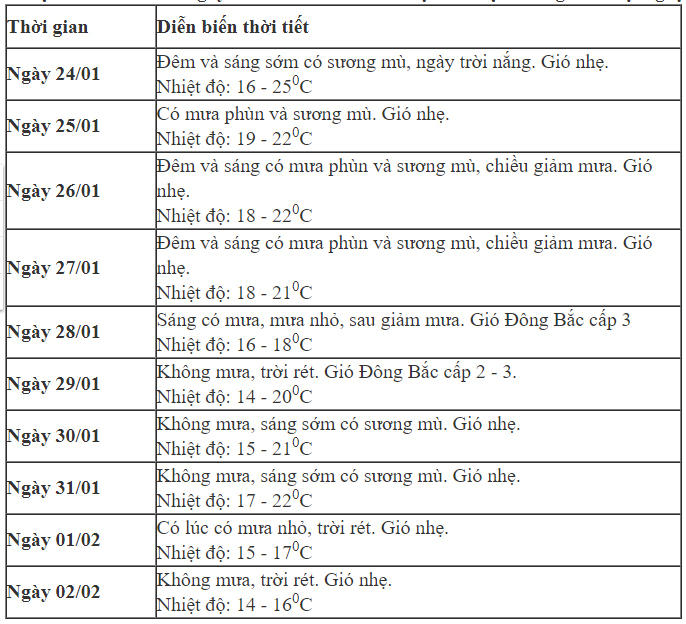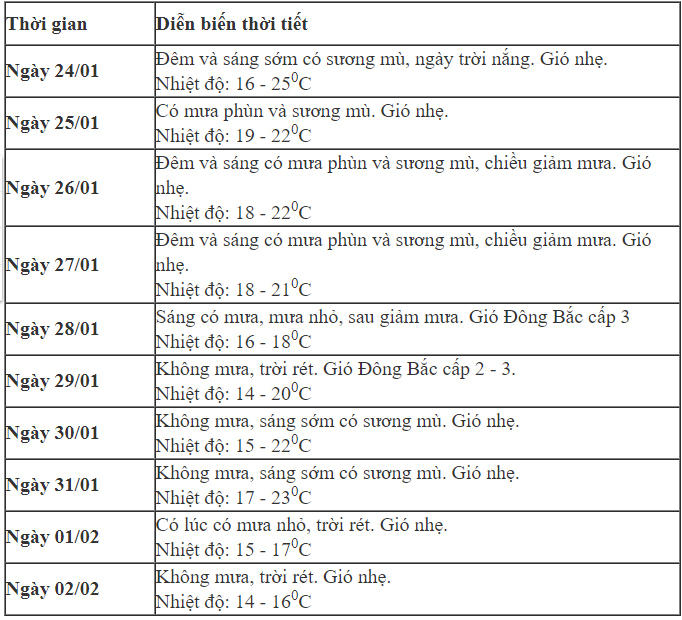 Từ ngày 29/1 đến ngày 31/2 có mưa vài nơi, riêng từ ngày 30/1-31/1 sáng sớm có sương mù. Trời rét. Nhiệt độ thấp nhất 14-17 độ C; cao nhất 20-23 độ, có nơi trên 23 độ C.