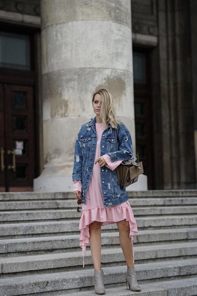 Thời trang là bất quy tắc cho nên bạn đừng ngại chọn những item đối lập với nhau để tạo sự khác biệt. Như chiếc đầm hồng rất điệu này với áo khoác jean mạnh mẽ.
