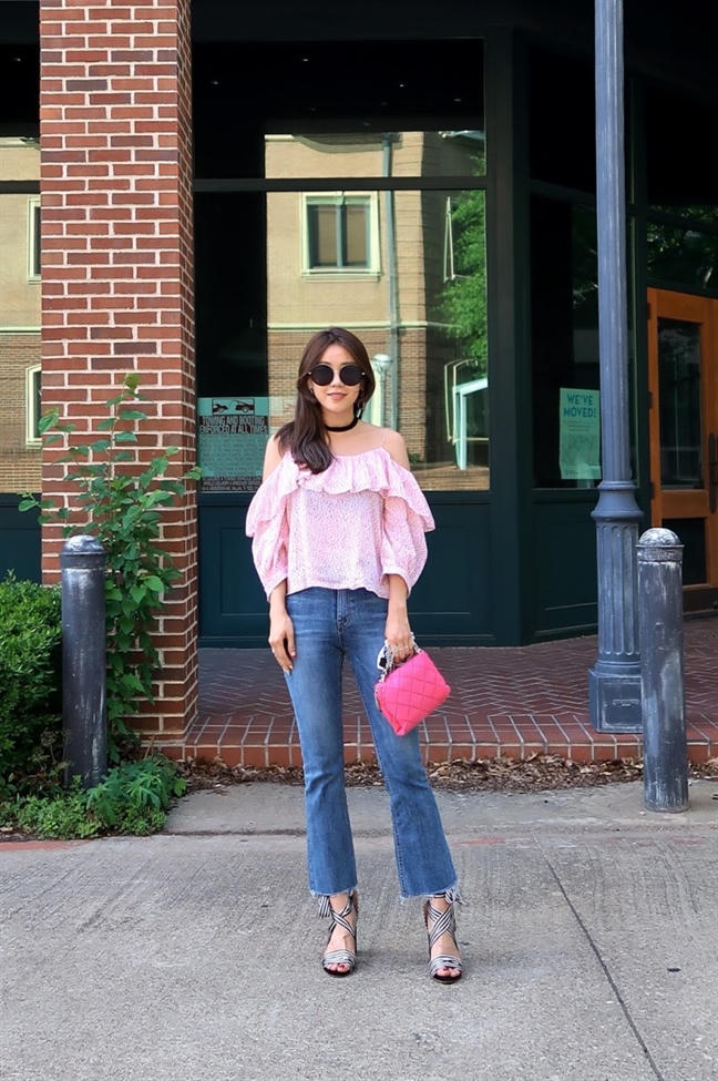 Quần ống loe và áo bẹt vai vẫn đang còn mốt và không "bánh bèo" phải không các nàng?