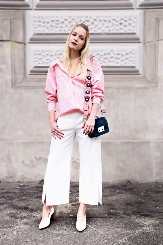 Màu trắng và hồng được xem như cặp bài trùng, hãy nhớ nguyên tắc phối màu này khi muốn diện màu hồng. Áo sơ mi và quần suông chưa bao giờ gây thất vọng cho các tín đồ thời trang.