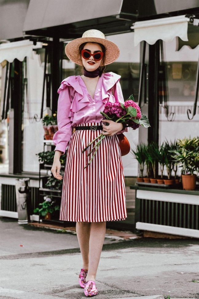 Áo cổ bèo màu hồng siêu nữ tính kết hợp với chân váy sọc dọc đỏ đô cá tính. Một sự tương phản nhưng đồng điệu đến ấn tượng.