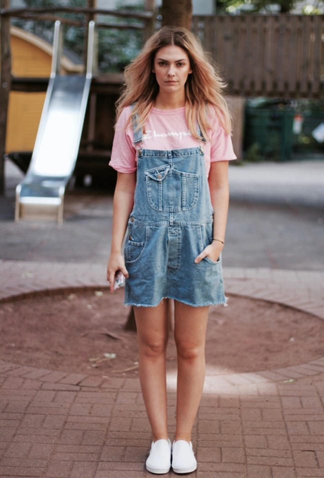 Hay đơn giản chỉ là yếm jean xanh basic với áo phông hồng là bạn trông đã rất cute rồi.