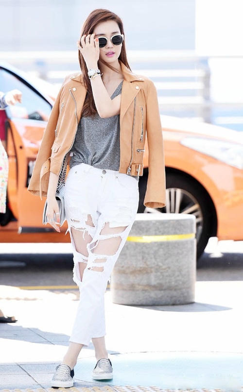 Lee Da Hae mặc áo khoác jeans rách bên ngoài, áo thun trắng đơn sắc và quần short jeans tua rua trong chuyến bay đến đảo Jeju (Hàn Quốc).