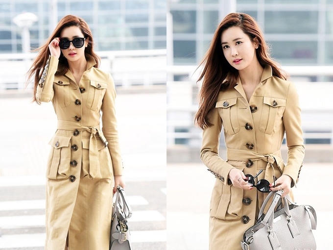 Da Hae khoe vẻ nữ tính với chiếc trench coat màu camel (vàng lạc đà) của Burberry. Thiết kế có giá 4 triệu won (khoảng 3.700 USD).