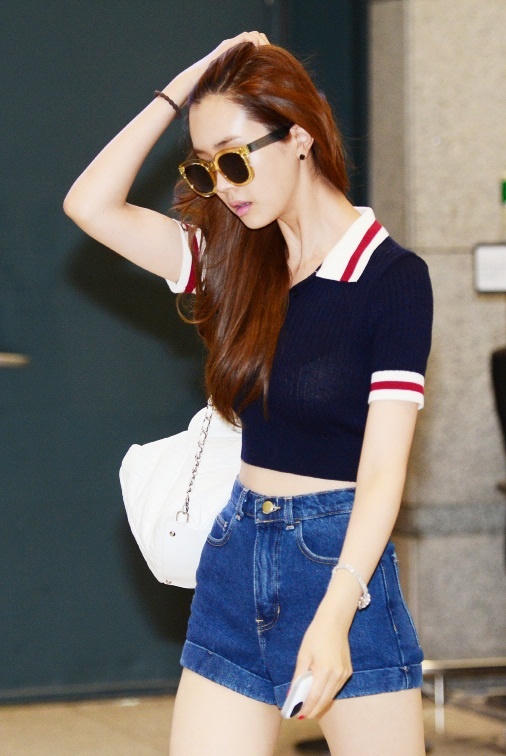 Một ngày sau đó cô bay về nước với trang phục trẻ trung - quần short kết hợp áo thun ngắn.