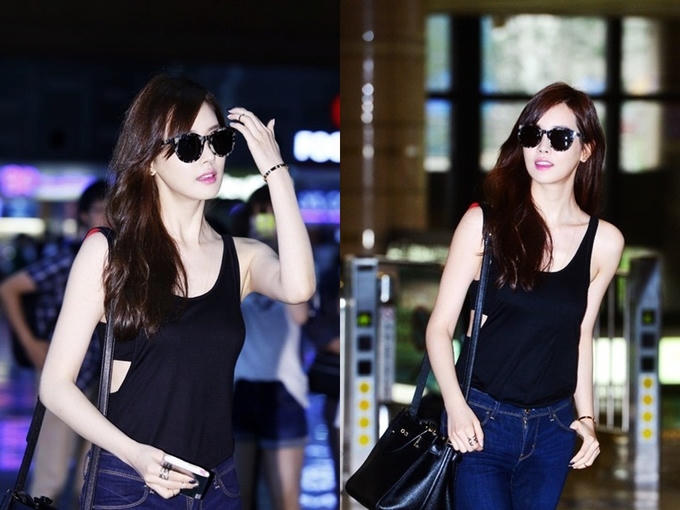 Trong một lần tới Thượng Hải (Trung Quốc), diễn viên diện áo ba lỗ đen khoét eo của Alexander Wang, quần jeans bó Levi’s. Chiếc túi xách từ thương hiệu J.Estina và mắt kính đen cao cấp A.D.S.R giúp cô hoàn thiện set đồ.