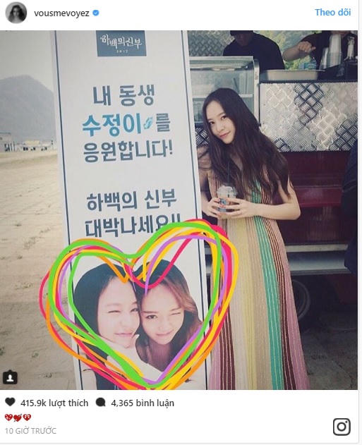Tấm poster lớn in hình hai chị em thân thiết cùng lời nhắn của Jessica: “Tôi cổ vũ cho em gái SooJung. Phim Cô dâu thủy thần cố lên nhé”. Còn Krystal thì vẽ thêm hình trái tim vào ảnh hai chị em, như một cách biểu lộ tình chị em gắn bó.