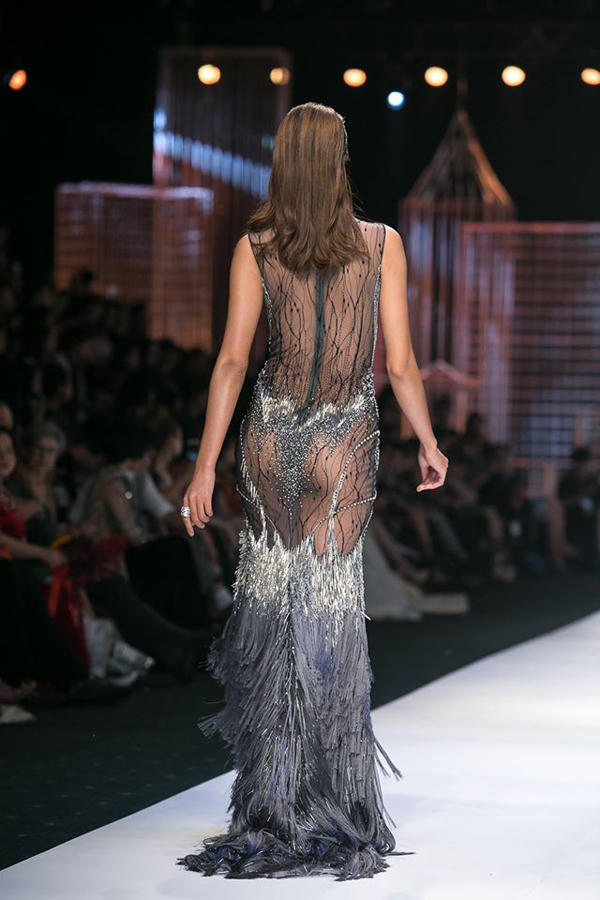Cách kết hợp vải lưới, vải nude cùng kỹ thuật đính kết sắc xảo đã giúp cho người mẫu gây được ấn tượng mạnh mẽ khi xuất hiện trên sàn catwalk.