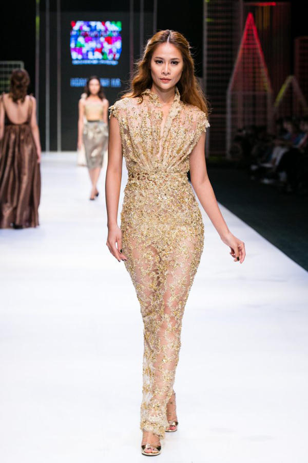 Vải trong suốt, vải sheer dệt sequin và vải voan mỏng vá ren tiệp màu là sự lựa chọn của Hoàng Minh Hà.