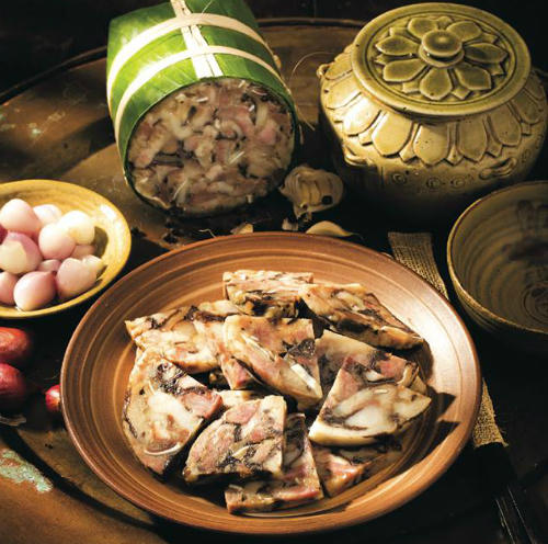 Cho thịt vào khuôn nén lại hoặc gói trong lá chuối, ép chặt. Đợi thịt nguội mới cho vào ngăn mát tủ lạnh, khoảng 8 tiếng thịt đông lại là dùng được.