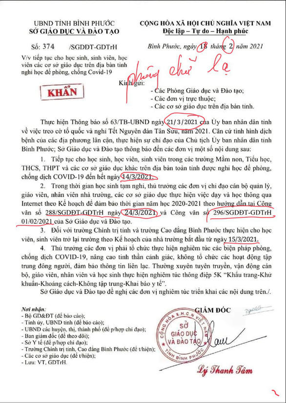 Tối 18/2, mạng xã hội lan truyền một văn bản số 374/SGDĐT-GDTrH do Giám đốc Sở GD&ĐT tỉnh Bình Phước Lý Thanh Tâm ký ban hành về việc tiếp tục cho học sinh, sinh viên, học viên các cơ sở giáo dục trên địa bàn tỉnh nghỉ học để phòng chống Covid-19 đến hết ngày 14/3.