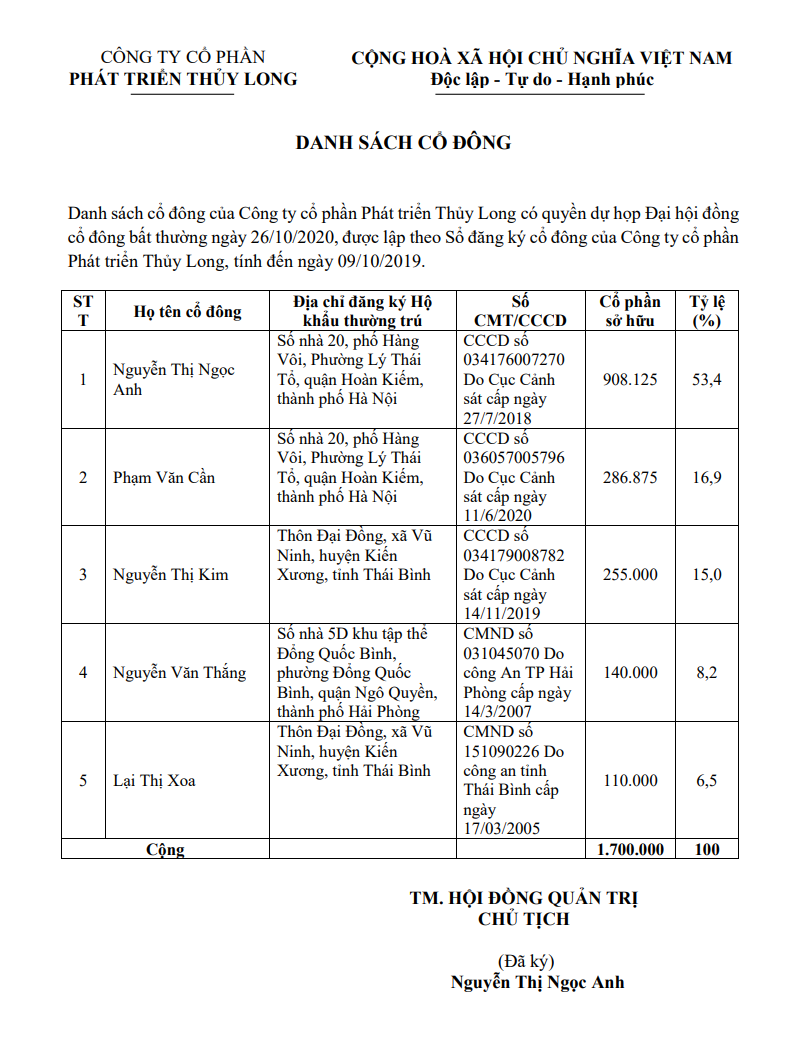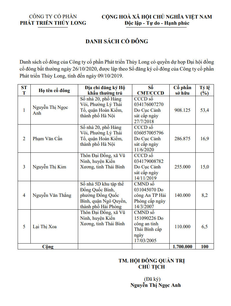 Cổ đông sở hữu cổ phần phổ thông theo danh sách cổ đông được lập ngày 09/10/2020; cổ đông ủy quyền được hợp pháp theo mẫu ủy quyền kèm theo thông báo mời họp phiên họp Đại hội đồng cổ đông bất thường của Công ty Cổ phần Phát triển Thủy Long.