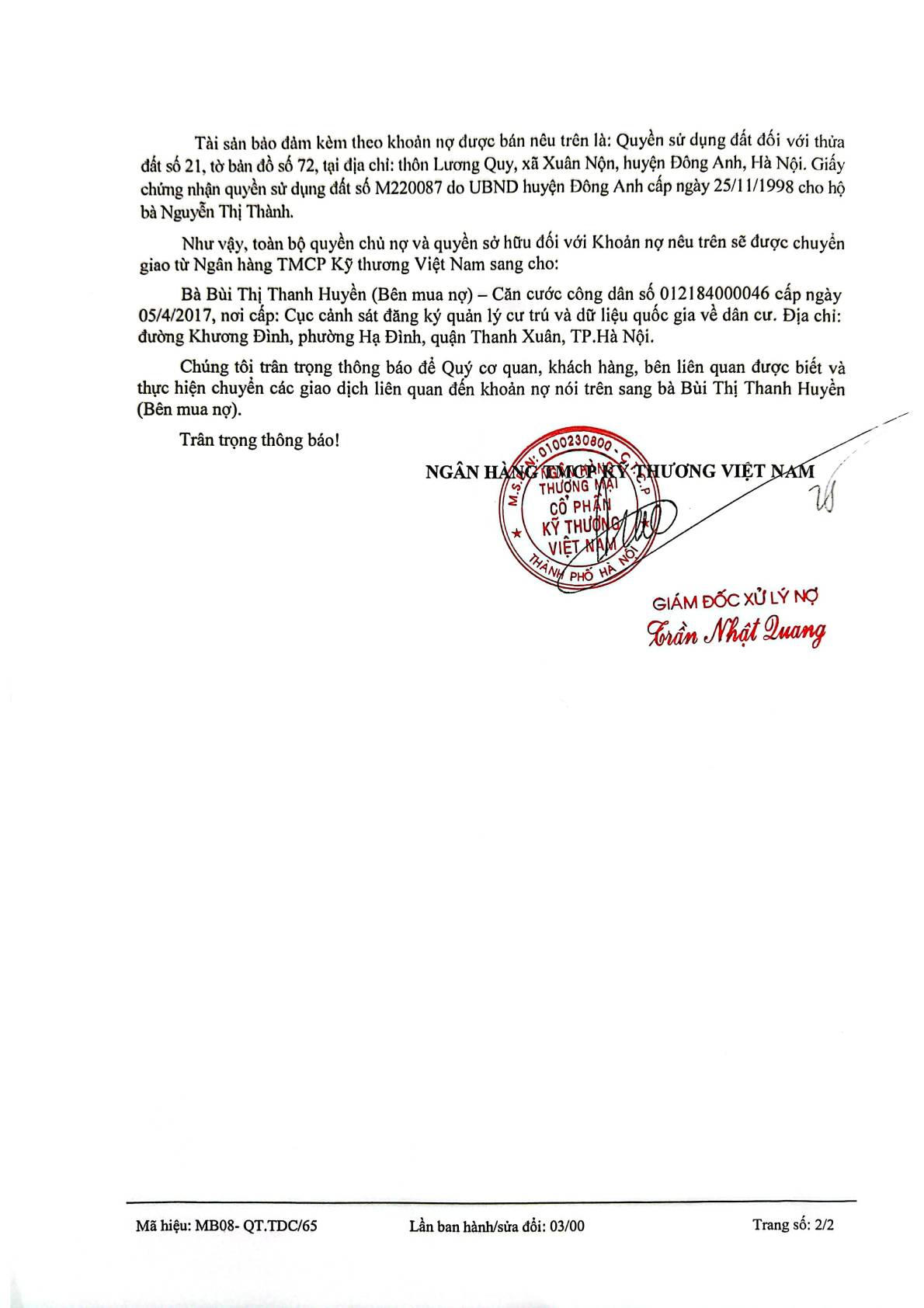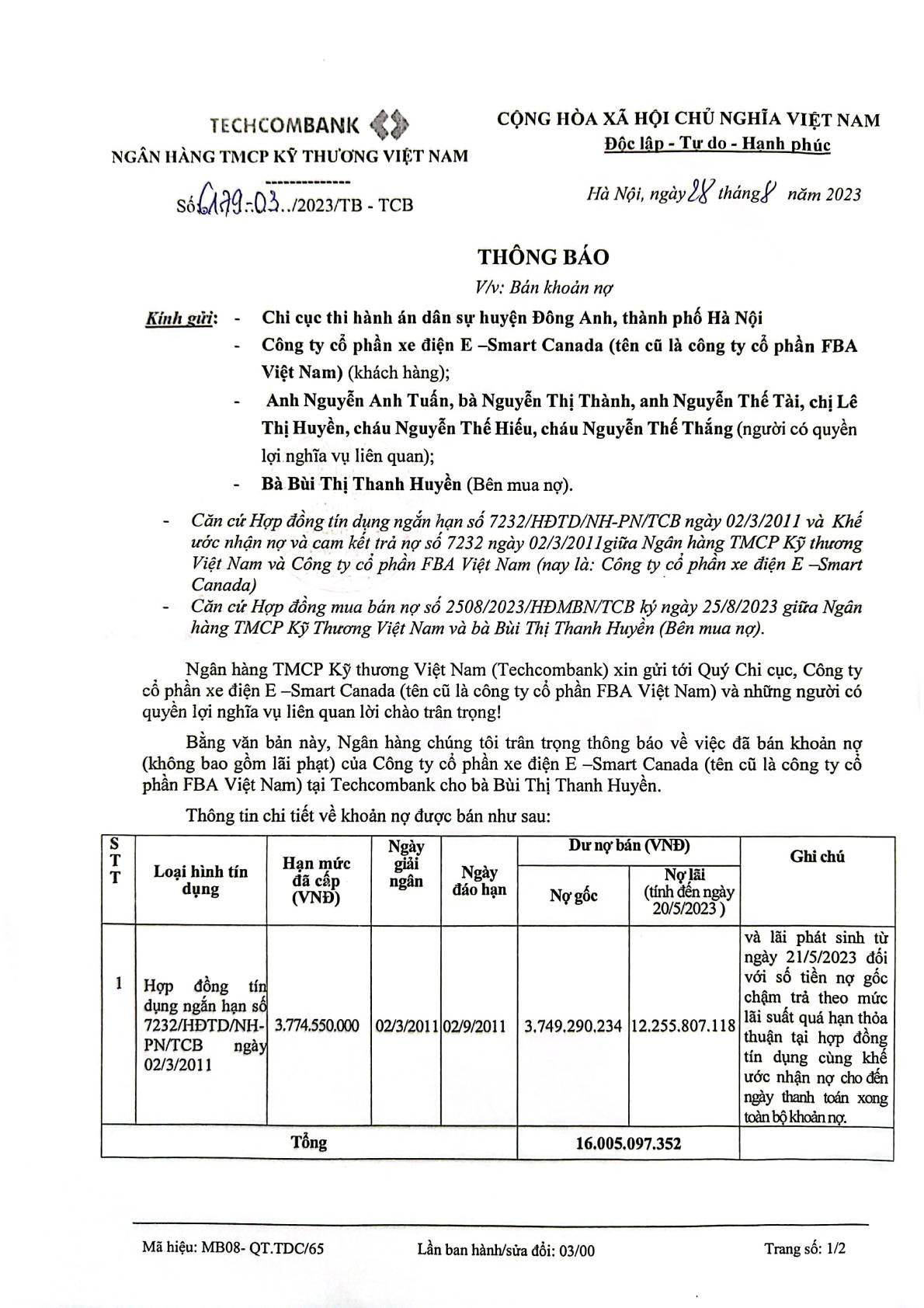 Thông báo về việc bán khoản nợ Ngân hàng TMCP Kỹ thương Việt Nam thông báo về việc đã bán khoản nợ của Công ty cổ phần xe điện E-Smart Canada (tên cũ là Công ty Cổ phần FBA Việt Nam). Thứ Tư 27/09/2023 14:09 (GMT+7)