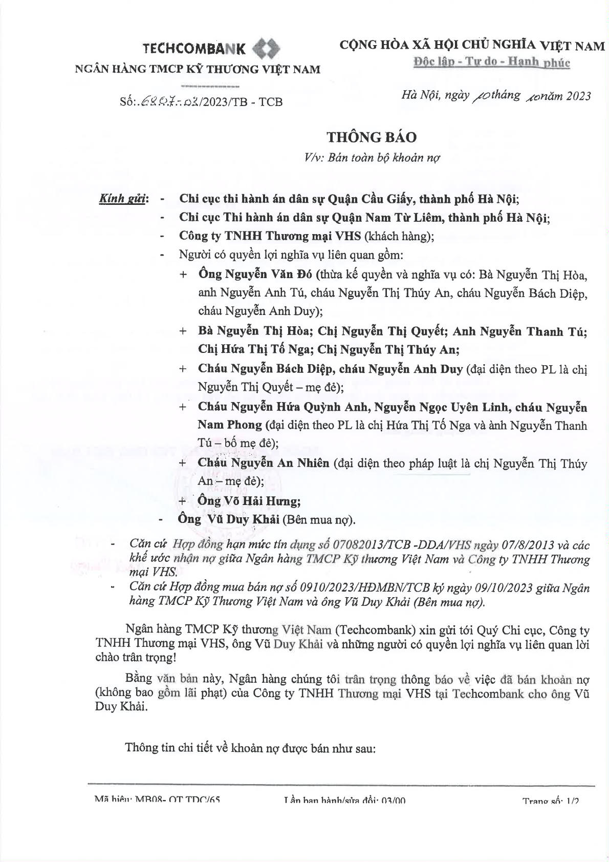Thông báo về việc bán khoản nợ Ngân hàng TMCP Kỹ thương Việt Nam thông báo về việc đã bán khoản nợ: Thứ Tư 18/10/2023 14:39 (GMT+7)