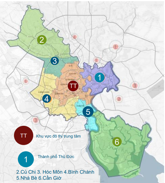 Từ sau năm 2030, TP HCM sẽ có khu vực trung tâm (các quận nội thành) là đô thị đặc biệt và 4 đô thị trực thuộc gồm TP Thủ Đức, 3 đô thị vệ tinh loại II hoặc III, gồm: phía Bắc (Hóc Môn - Củ Chi), phía Tây (Bình Chánh), phía Nam (huyện Nhà Bè, Cần Giờ và quận 7). Ranh giới chính thức của các đô thị trực thuộc TP HCM sẽ được xác định khi thành lập các đô thị này.