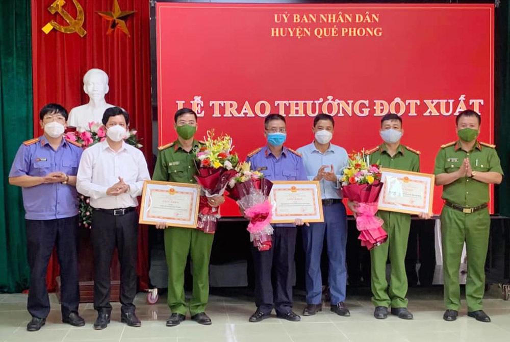 Ông Dương Hoàng Vũ - Chủ tịch UBND huyện Quế Phong đã trao thưởng đột xuất, tặng giấy khen cho cán bộ công an huyện Quế Phong và VKSND đã tham gia phá án, bắt nghi can truy sát hai mẹ con chị Đ sau 13 giờ phá án.