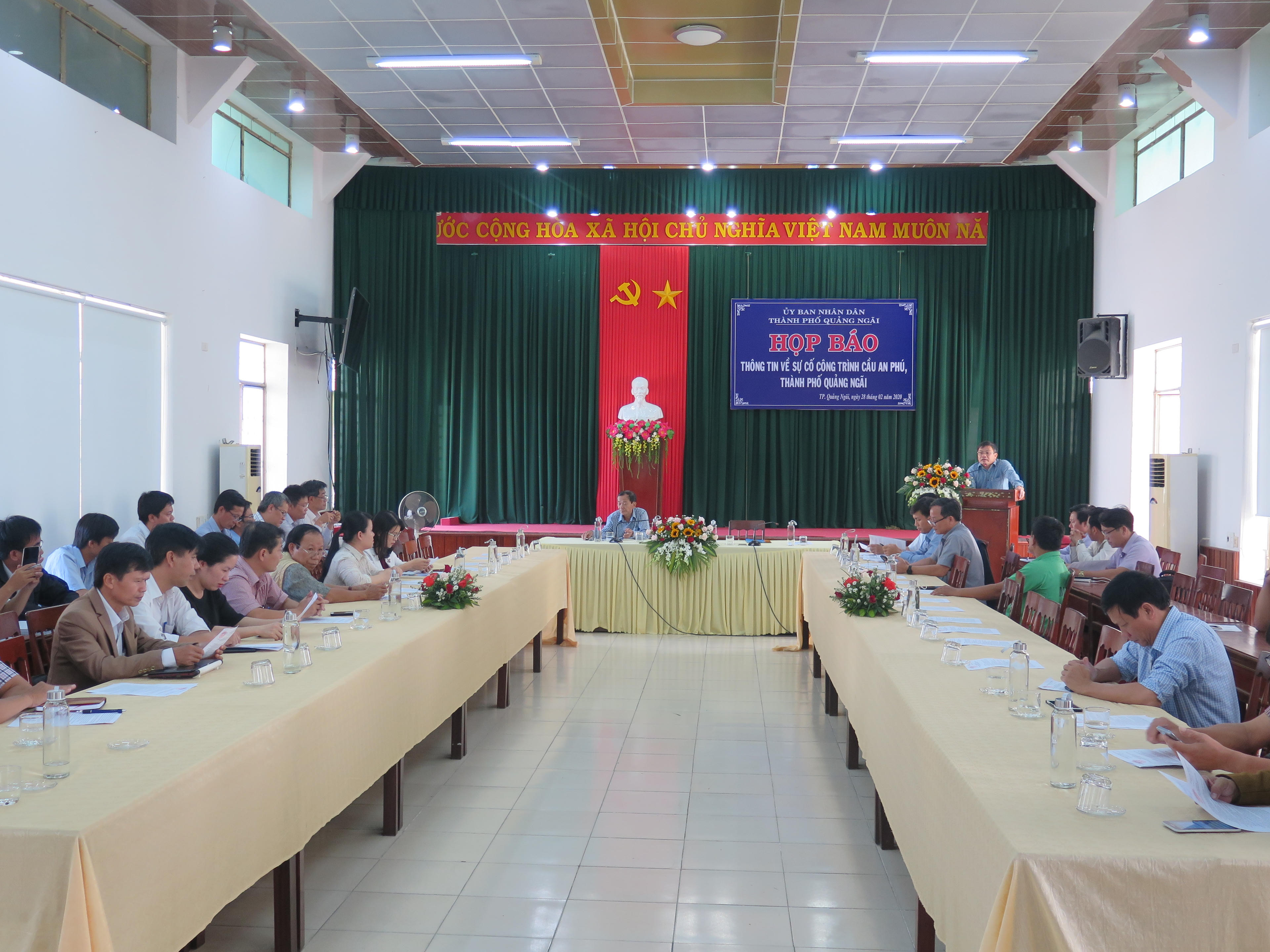 (PLVN) - Chiều 28/2, UBND TP. Quảng Ngãi (tỉnh Quảng Ngãi) tổ chức họp thông tin về sự cố gãy dầm cầu An Phú (bắc qua sông Phú Thọ thuộc TP. Quảng Ngãi) trong lúc đang thi công lắp đặt.