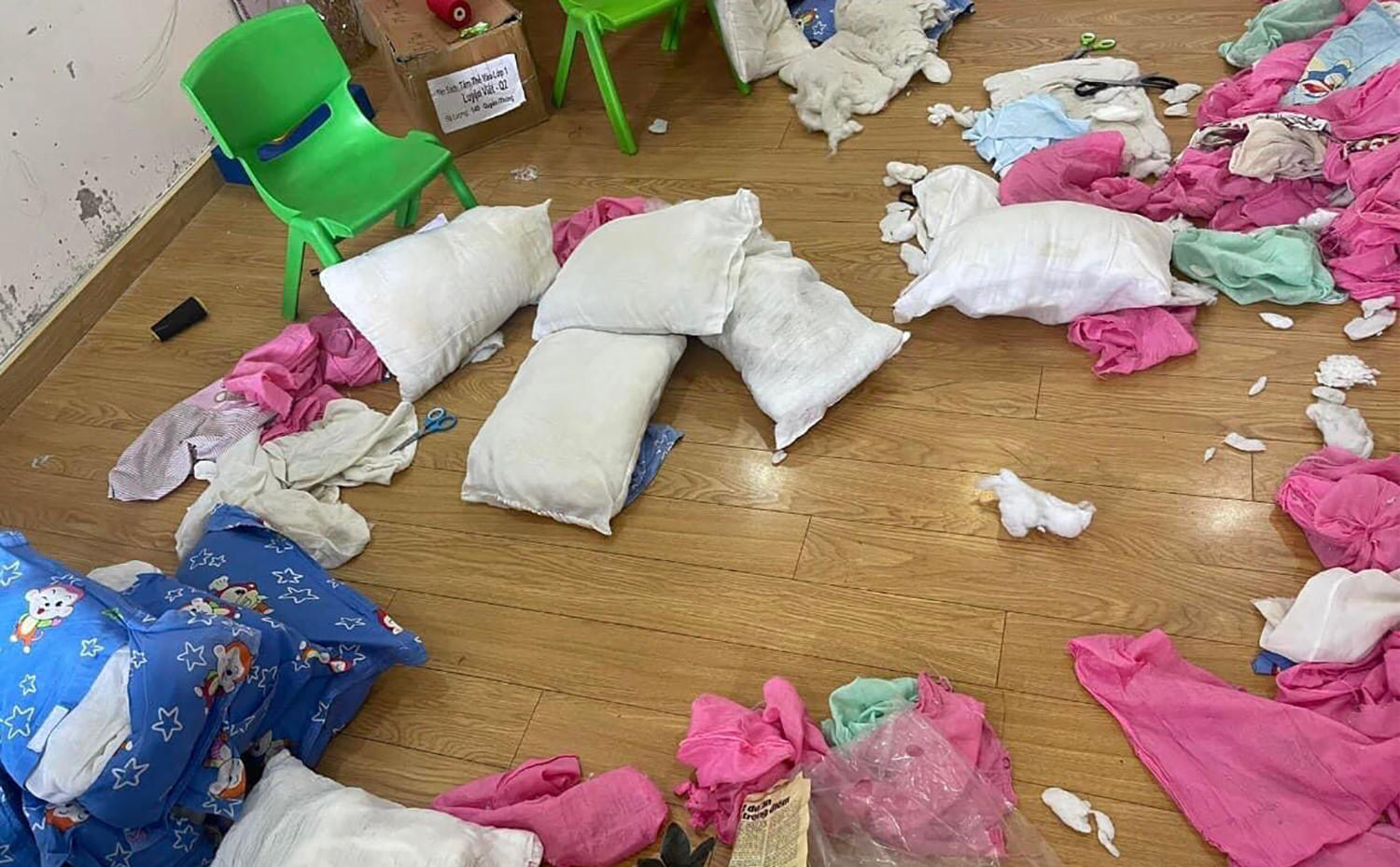 Những chiếc gối ngủ của trẻ bị vứt tung khắp sàn. Ảnh: Mạng F.B |