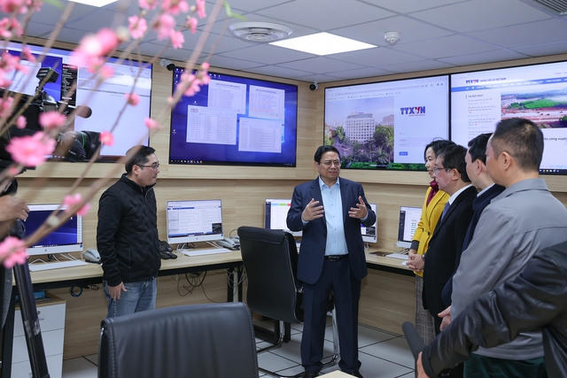 Kiểm tra công tác trực Tết của TTXVN tại Phòng Điều độ thông tin (Data Center) thuộc Trung tâm Kỹ thuật Thông tấn, Ban Biên tập tin Trong nước và Ban Biên tập tin Thế giới, Thủ tướng lưu ý phải luôn đảm bảo kết nối thông tin thông suốt với các hãng thông tấn quốc tế; các bộ phận tin đối ngoại và đối nội phải kết hợp chặt chẽ; cung cấp thông tin phong phú cho độc giả trong và ngoài nước, giúp thế giới hiểu hơn Việt Nam đang làm gì; chú trọng hơn nữa công tác chuyển đổi số, dữ liệu mới…