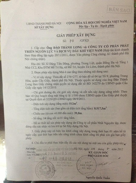 Tới ngày 4/7/2012, ông Nguyễn Quốc Tuấn, PGĐ Sở Xây dựng Hà Nội đã ký giấy phép số giấy 70/GPXD cấp cho ông Đào Thành Long và công ty Petromanning (hợp tác kinh doanh theo hợp đồng lập ngày 20/11/2011).