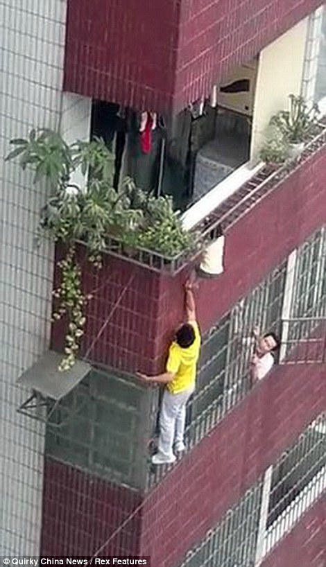 Người dân xung quanh đã tìm một chiếc chăn rộng và căng phía dưới, đề phòng trường hợp cậu bé bị rơi. Một người đàn ông hàng xóm ở tầng dưới đã dũng cảm trèo qua cửa sổ nhà mình để đứng đỡ cậu bé. Sau khi giữ được chân của cậu bé, người đàn ông này đã cố gắng kéo cậu bé vào nhà của mình.