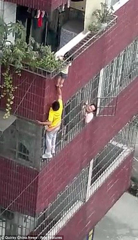 Một cậu bé Trung Quốc đã bị mắc kẹt đầu tại ban công trước nhà với độ cao trên 12m.