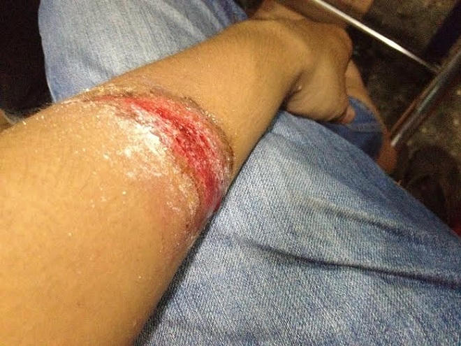 Chỉ vào một bầm tím trên chân, anh bảo: “Làm công việc này, thỉnh thoảng tay chân có vài vết bầm tím là chuyện bình thường. Vết này anh bị cách đây mấy tháng rồi nhưng có thể nó bị dập bên trong nên vẫn chưa đỡ, thấy mất cảm giác luôn.
