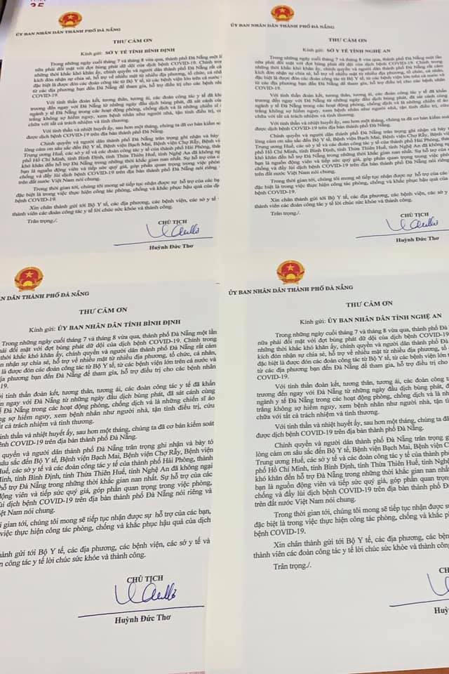 Bày tỏ lòng tri ân trước những nghĩa cử cao đẹp của đội ngũ y bác sĩ từ các nơi ngược về tâm dịch, chiều 31/8, Chủ tịch TP Đà Nẵng Huỳnh Đức Thơ đã có thư cảm ơn gửi các đoàn.