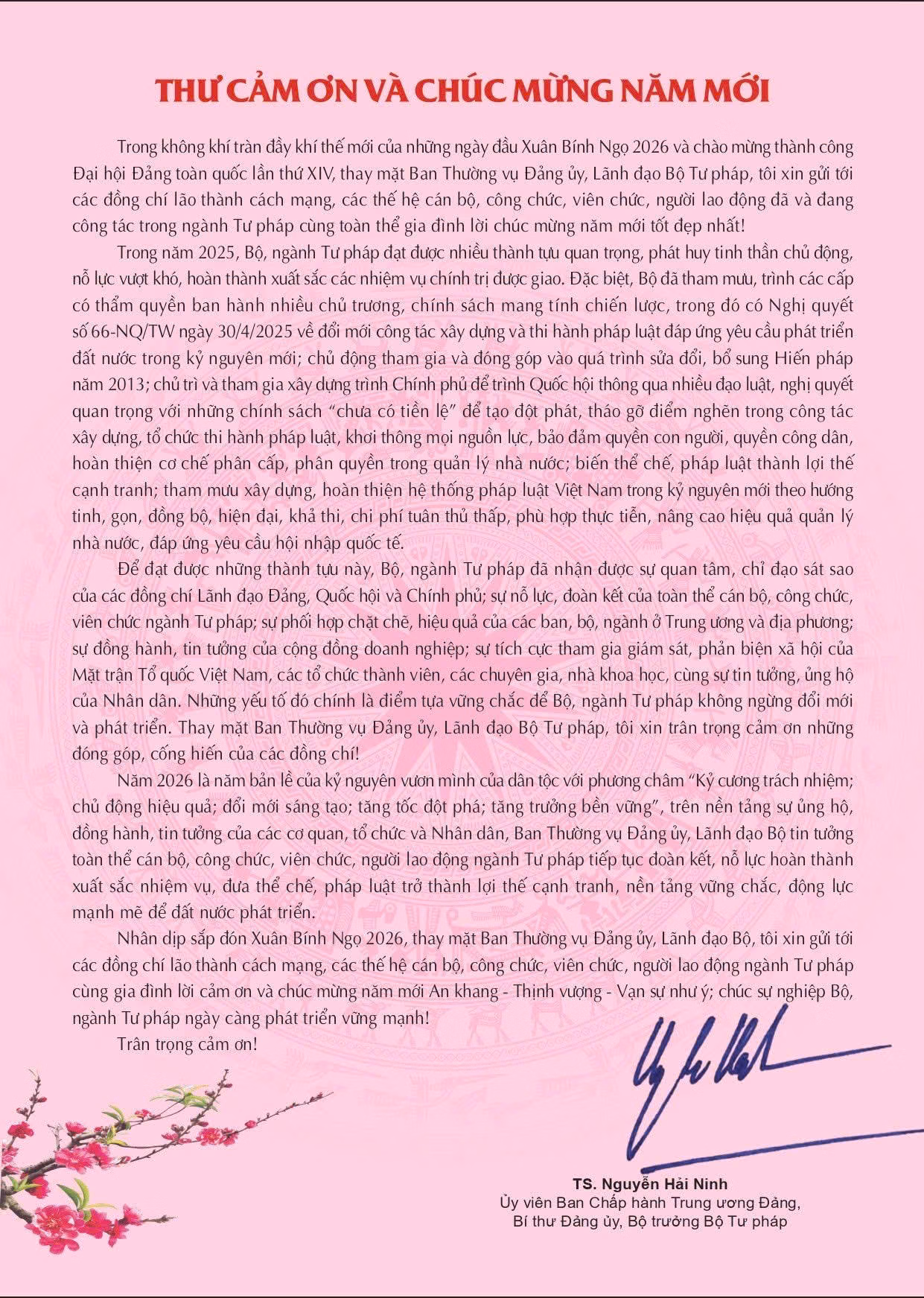 Thư cảm ơn và chúc mừng năm mới của Bộ trưởng Bộ Tư pháp